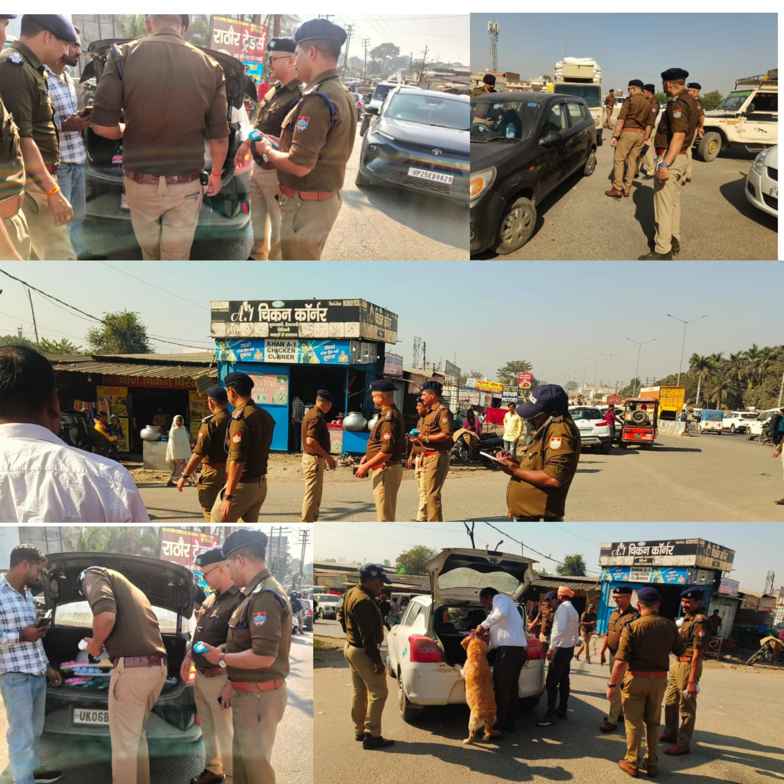 आज अपर पुलिस महानिदेशक कानून व्यवस्था उत्तराखंड के आदेश पर प्रभारी निरीक्षक  रुद्रपुर एवं प्रभारी निरीक्षक ट्रांजिट कैंप के नेतृत्व में तीनपानी तिराहा UP बार्डर में थाना रुद्रपुर एवं ट्रांजिट कैंप पुलिस टीम द्वारा डॉग स्क्वायर्ड, एचएमडी, बीपी जैकेट आदि उपकरणों के साथ सघन चैकिंग अभियान चलाकर कुल 150 छोटे बड़े वाहनों की चेकिंग की गई, दौराने चैकिग यातायात नियमों का उल्लंघन करने वाले वाहन चालकों एव वाहन स्वामियों के विरुद्ध एमवी एक्ट में 11चालान किया गए।